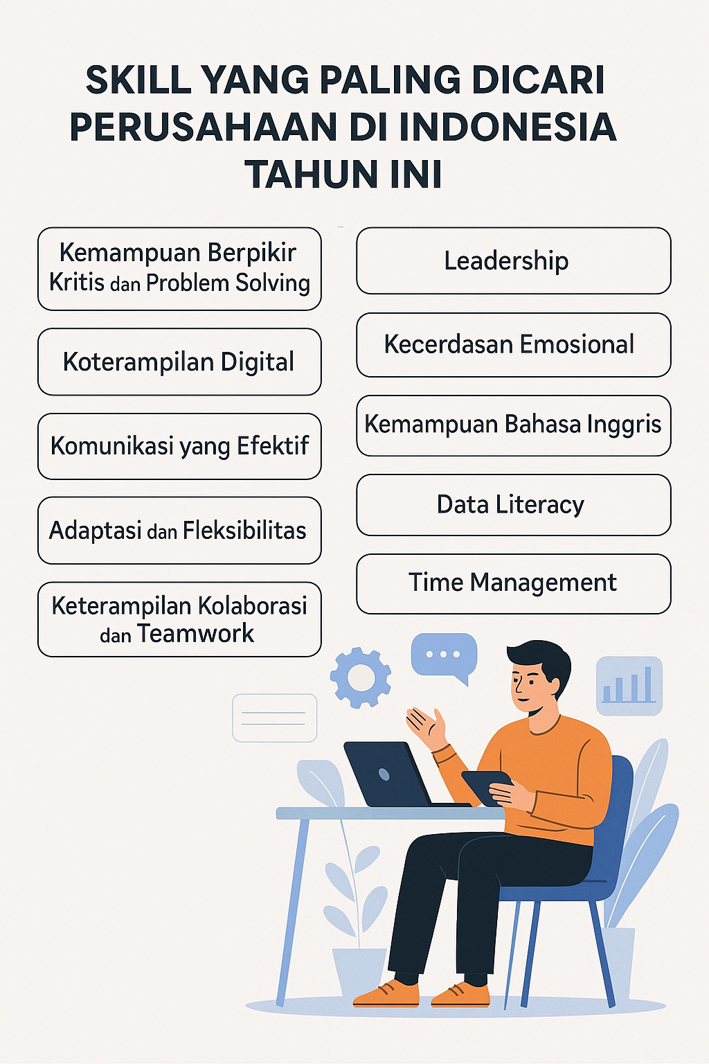 Di tengah dunia kerja yang makin dinamis dan serba cepat, punya skill yang tepat bukan cuma nilai tambah—tapi sudah jadi kebutuhan. Dunia kerja Indonesia saat ini sedang bergerak ke arah yang sangat menarik: teknologi makin canggih, bisnis makin kompetitif, dan ekspektasi perusahaan terhadap karyawan juga makin tinggi. Jadi, pertanyaannya bukan lagi “Apa pekerjaan impianmu?”, tapi “Skill apa yang bisa bikin kamu tetap relevan?”
